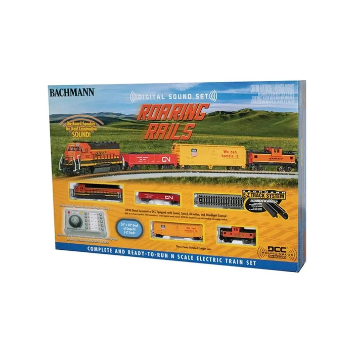 The Roaring Rails powerful locomotive sounds its horn and rings its bell to warn everyone along the line that nothing can deter this train from finishing its route. Roaring Rails features a DCC sound-equipped GP40 with a diesel sound package that includes prototypical prime mover, three air horns, and bellall in polyphonic 16-bit sound that you can control with the E-Z Command digital control system.