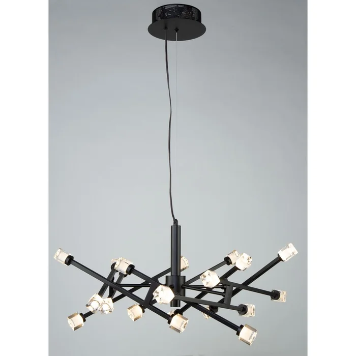 The “Batton” collection mid size pendant features glass cubes illuminated by LEDs. The frame’s arms can be configured as desired and has a black finish (includes hang straight).