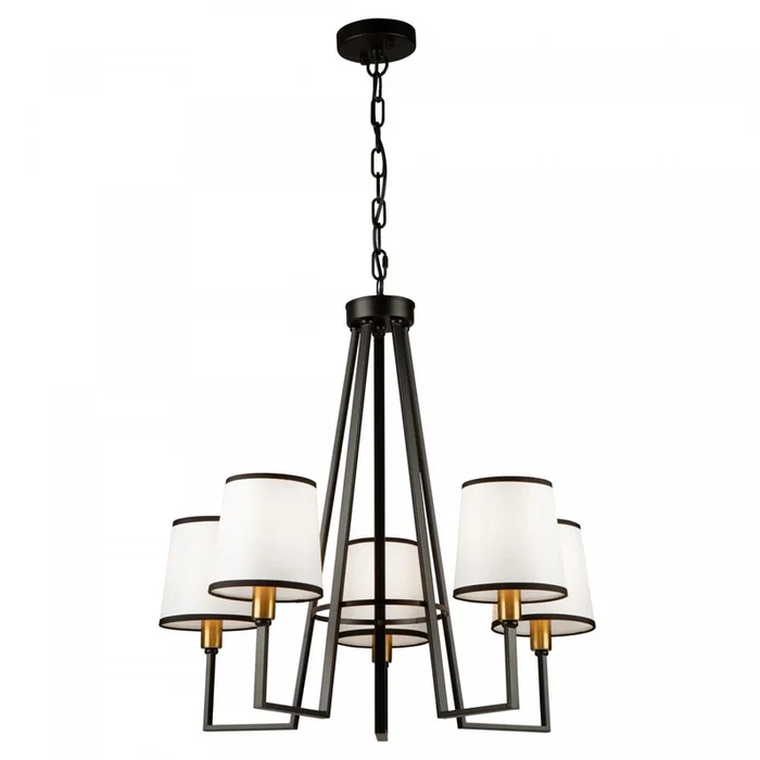From the S&C design firm, with strict direction from Steven Sabados, the Coco Collection chandelier features a transitional frame which has flat type arms. The frame is finished in a rich matte black, and has harvest brass accents. The hardback white linen shades are complimented with upper and lower black trims to finish off the design. Make a statement in your home.