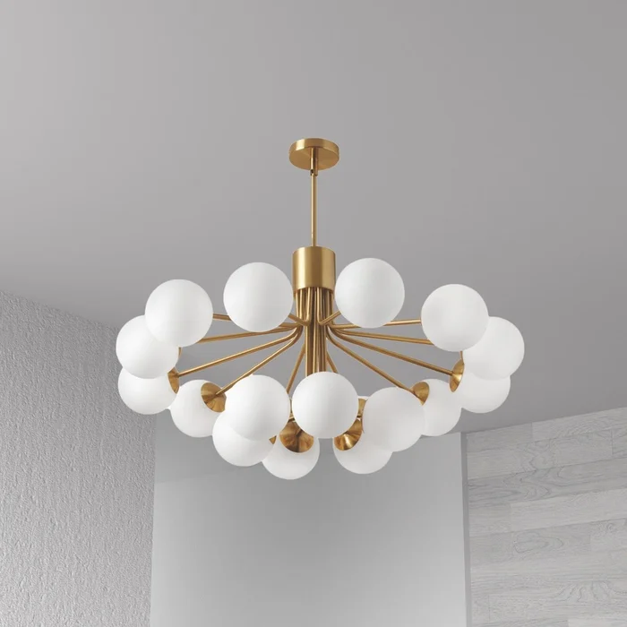 Dainolite Amanda 9 Light Chandelier Aged Brass White Opal Glass Lamp|Lustre Amanda de Dainolite en verre blanc opale, avec fini laiton vieilli et 9ampoules