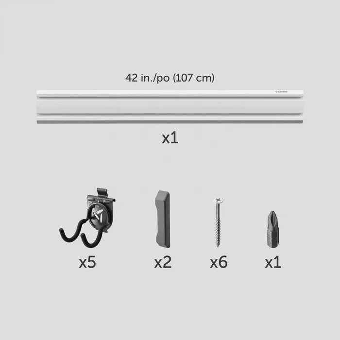 Each of the five versatile Scoop Hooks on the Multipurpose GearTrack Pack holds both heavier and lightweight items ranging from packed tote bags to spring jackets. Includes: (5) Scoop Hooks, (1) 42 GearTrack Channel, (2) End Caps, (6) Color Matched Screws, (1) Compatible Driver Bit