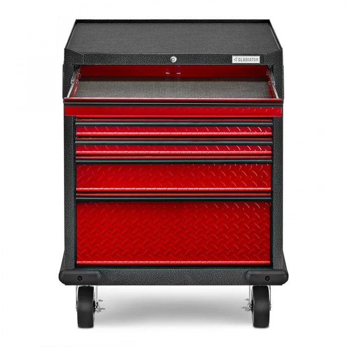 At two feet deep, the Premier Modular 7 Drawer GearDrawer cabinet provides superior gear and tool storage capacity over our typical 18 deep cabinets. Each of the seven drawers features solid metal drawer handles, rides on full-extension ball bearing slides for smooth operation and includes cushioned drawer liners. Built for storage and engineered to last with welded steel double-side wall construction that allows for exceptional structure and ideal support for storage needs. Have easy access to tools with large total tool storage capacity. Ideal for medium to small hand tools. Provides mobile tool storage and mobility for all projects with heavy-duty solid rubber 5 in. x 2 in. caster wheels that increase this units stability. The front caster wheels lock to hold the unit in place while swiveling rear caster wheels making the unit easy to move and dock under modular workbenches.