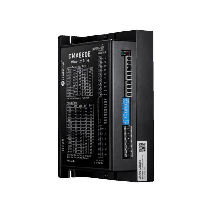 The DMA860E is a digital stepper drive with simple design and easy setup. By implementing Leadshine advanced stepper control technology, this stepper drive is able to power 2-phase and 4 phase stepper motors smoothly with optimal torque and low motor heating & noise. Its operating voltage is 18-80VAC or 24-110VDC and it can output up to 7.2A current. All the micro step and output current are done via DIP switches. Therefore, the DMA860E are ideal choices for applications requiring simple step & direction control of NEMA 23, 24, 34, and 42 stepper motors.