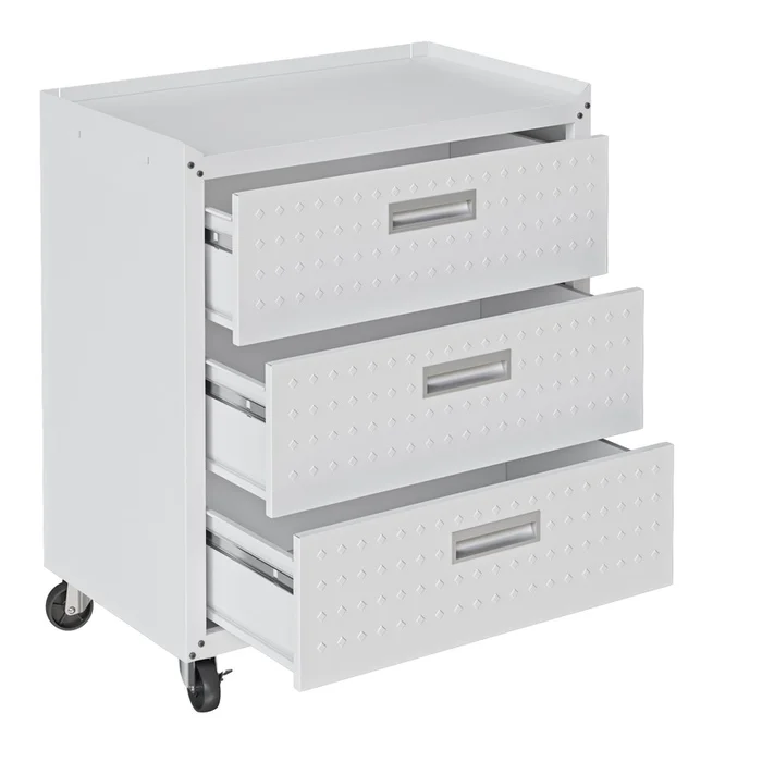 The Fortress 31.5 Mobile Garage Chest with Drawers is a highly durable, functional unit perfect for keeping items safe and organized with three full extending drawers for storing garage tools, accessories, and built in stainless swivel casters allowing for easy mobility. A piece that belongs in any garage, this chest is space saving without compromising on ample storage space or design.