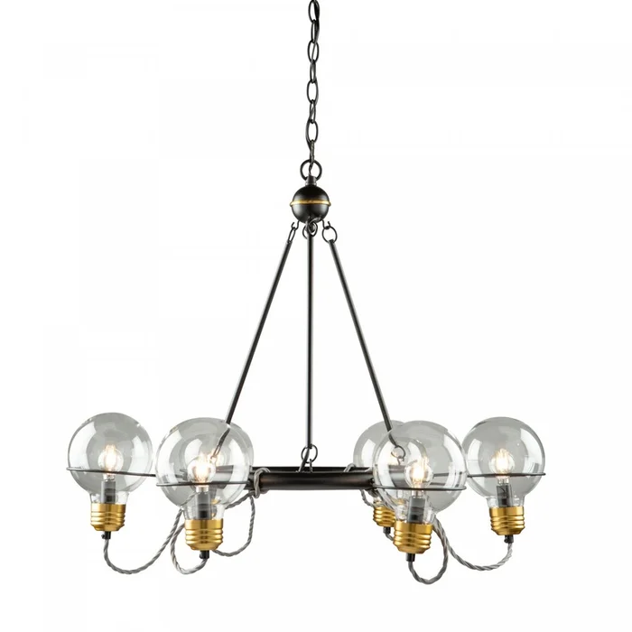 The “Martina Collection” is so unique from a design stance. The glass is actually shaped as a bulb and the bottom glass holder is designed like the bottom of a vintage screw type bulb. The wiring has a “vintage” element since it is twisted the way Thomas Edison first introduced the bulb. The metal work is black while the glass holder is brass. The small chandelier model is shown; there are many matching units available.