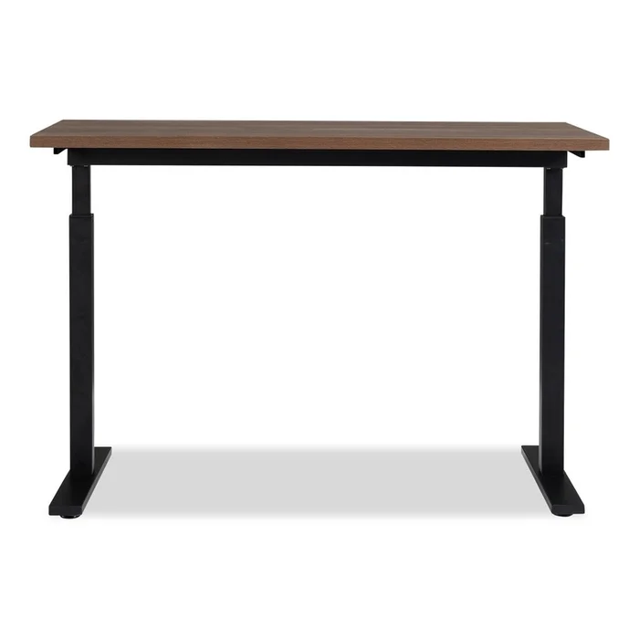 Work better and smarter with this Novah desk. This strong and sturdy workspace allows for a smooth transition from sitting to standing manually crank the handle under the desktop to add 18 inches of adjustable height. Its laminated surface radiates with a deep, brown woodgrain that, combined with black metal legs, creates a luxuriously modern appeal. Plus, the powder-coated legs offer stability, with pads under the feet to keep them from sliding on hard floors. Experience productivity and convenience with the Novah.