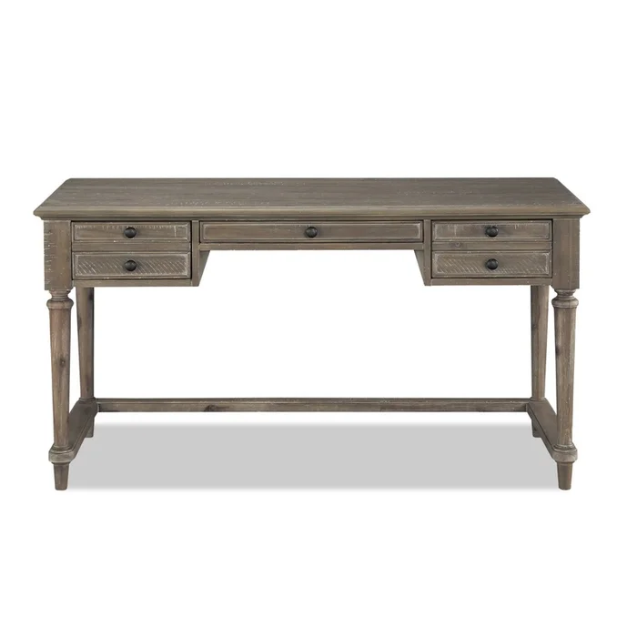 Create an impactful design presence in your home with this Winston writing desk. Different accents like plank effect, rasping and saw marks create a piece sure to elevate your office aesthetic. The traditional framing, pewter-finished hardware and light brown driftwood finish deliver a classic rustic style with a touch of flair that will help you love your work. Store papers, pens, gadgets and more in the three functional drawers and enjoy being prepared for your workday with the Winston.