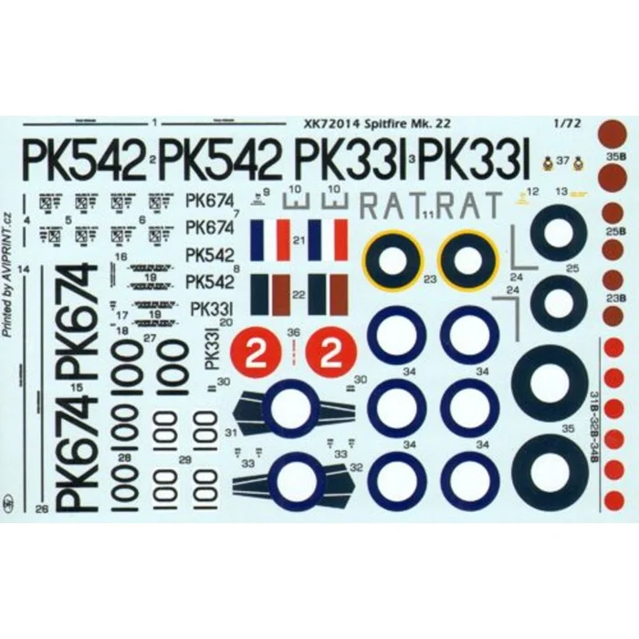 Supermarine Spitfire Mk.22 Includes decals for PK542, pilot J. Quill, Daily Express race – May 1951, four variations, PK674/L, No. 73 Sqn. RAF, Ta kali, Malta. PK331 RAT-E, No. 613 Sqn. Royal Auxiliary Air Force