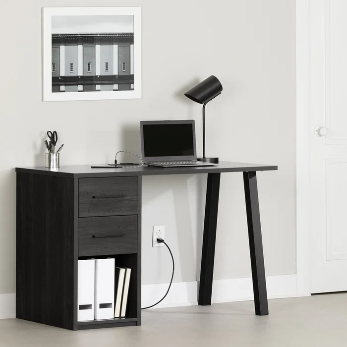 Improve your performance at work with this great functional computer desk. It features a large surface, where you can have a laptop and a screen, as well as space to relax your forearms and take notes. Theres also a power bar with two regular outlets and two USB ports. You can charge your electronics and keep them with you all day. The two drawers and the open space at the bottom will give you room to organize all your office supplies, including pencils, sheets, books, and even more. Youll have an ergonomic workspace thats organized the way you like it. Itll be easier than ever to concentrate.
